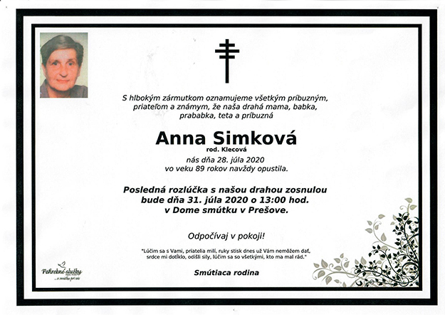 У віторок 28-го юла у віці 89 років навсе опустила дочкы, котры значать світ, бывша членка драматічного колектіву Театру Александра Духновіча в Пряшові Анна Симкова.